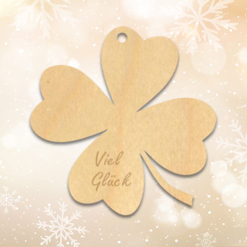 Unser Holzanhänger vierblättriges Kleeblatt wünscht "Viel Glück". Der Kleeblattanhänger eignet sich damit toll als AddOn auf einer Klappkarte oder Glücksbringer-Give-Away zu Silvester und anderen festlichen Anlässen.