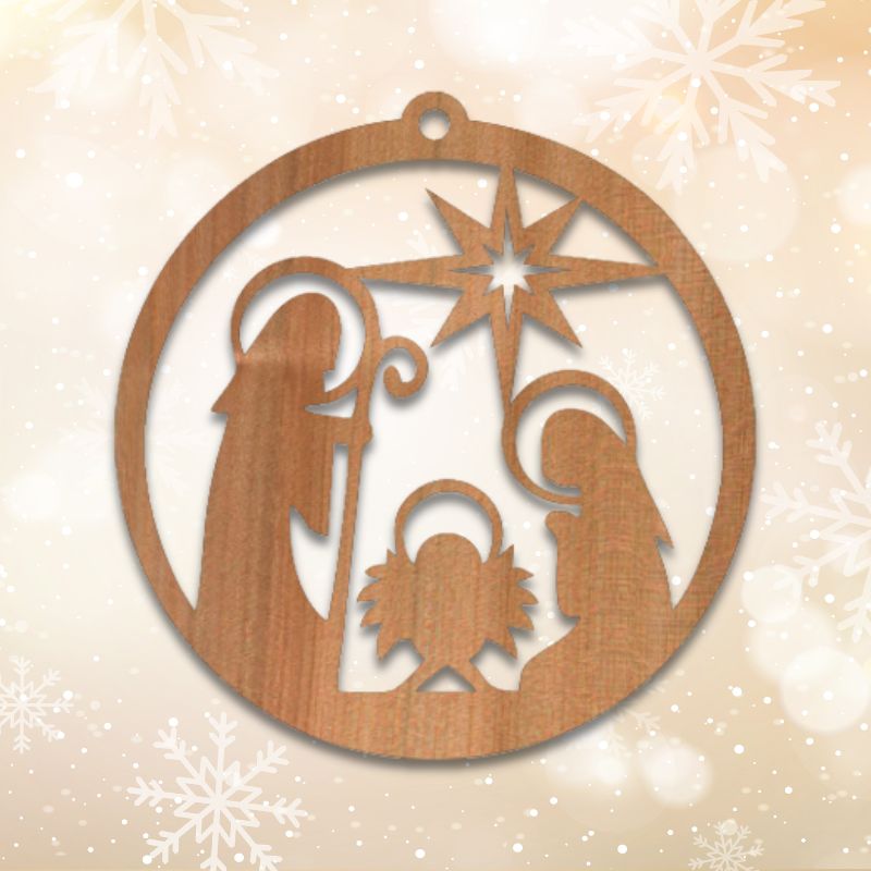 Dieser weihnachtliche Holzanhänger zeigt eine moderne Interpretation der Krippe zur Geburt Jesu.
