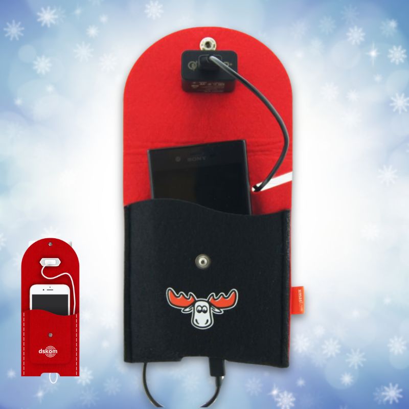 Die Smartphone-Ladetasche hat einen Druckknopf zum Verschließen, eine extra Tasche an der Rückseite und eignet sich besonders für moderne, große Smartphones. Der obere Teil der Ladestation lässt sich via Druckknopf über dem Elch befestigen. So wird die Ladetasche zu einer praktischen Filztasche für das Akkuladegerät, das Handy oder andere wichtige Dinge.
