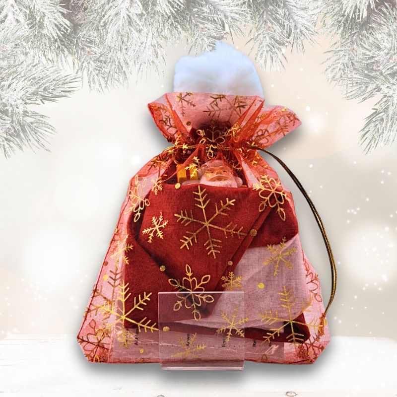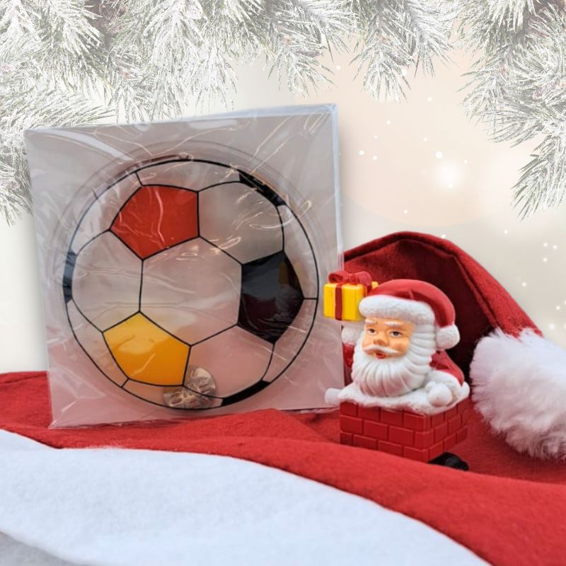 Das Geschenke-Set ist in einem rotfarbigen Organzabeutel mit einem Handwärmer im Fußball-Look, einer Weihnachtsmütze und einem Aufzieh-Weihnachtsmann gefüllt.