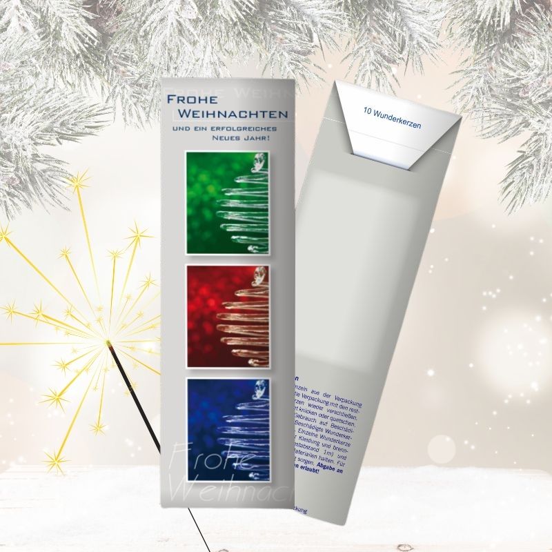 Die 10 Wunderkerzen sind in diesem Set in einer silberfarbenen Kartonsteckhülle verpackt, die drei filigrane Glas-Spiralkugeln zeigt - auf grünem, rotem und blauem Hintergrund - "Frohe Weihnachten!"