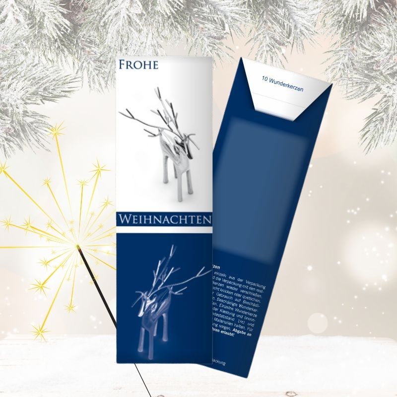 Auf der Karton-Stecktasche, in der 10 einzelne Wunderkerzen verpackt sind, ist stattdessen das sehr festliche Motiv eines filigranen und schönen Rentiers aus Metall zu sehen. Das Rentier steht einmal auf weißem und einmal auf blauem Grund.